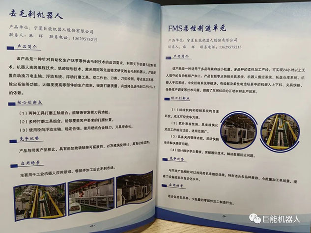 在《銀川市科技創(chuàng)新產品(2023)手冊》中,巨能機器人公司《去毛刺機器人》和《FMS柔性制造單元》兩項產品收錄其中。