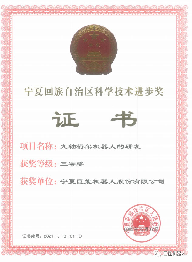 其中,《九軸桁架機器人的研發(fā)項目》榮獲2021年自治區(qū)科學技術進步三等獎。