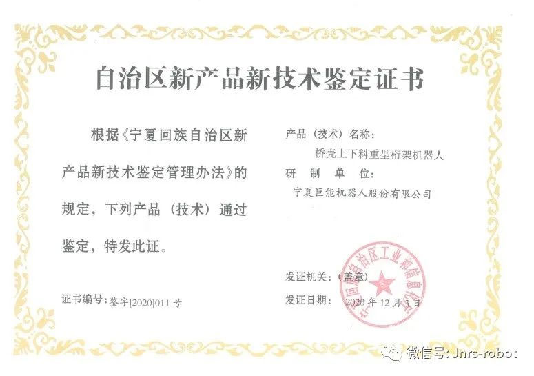 巨能機(jī)器人針對(duì)商用車車橋橋殼單機(jī)加工效率低、零件無法自動(dòng)兼容、混線生產(chǎn)等問題,研制了龍門結(jié)構(gòu)的橋殼上下料重型桁架機(jī)器人。近日,產(chǎn)品通過了自治區(qū)新產(chǎn)品鑒定評(píng)審,獲得鑒定證書。