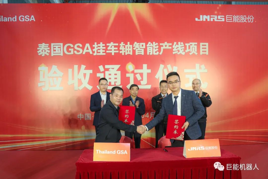 項(xiàng)目的預(yù)驗(yàn)收通過(guò),充分展現(xiàn)了巨能公司對(duì)于大型復(fù)雜項(xiàng)目的管理和交付能力,再次印證巨能公司是一家制造“智能工廠(chǎng)”的工廠(chǎng)。隨后,該產(chǎn)線(xiàn)將正式裝船出海“出嫁”到泰國(guó)進(jìn)行安裝調(diào)試,巨能機(jī)器人產(chǎn)品將代表中國(guó)“智造”整體交鑰匙解決方案走向海外。預(yù)祝泰國(guó)GSA項(xiàng)目早日順利投產(chǎn)!
